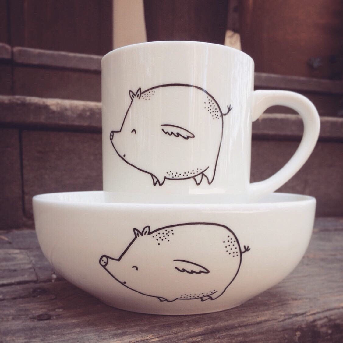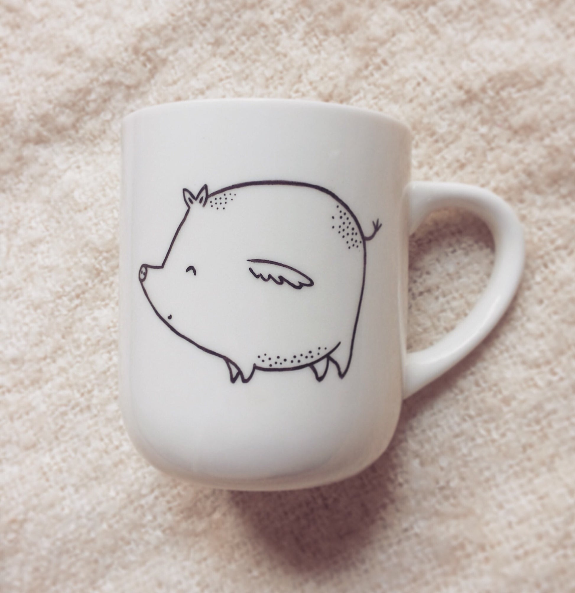 A hand illustrated mug with a cute Winged Piglet, ready to brighten up every morning tea or coffee.