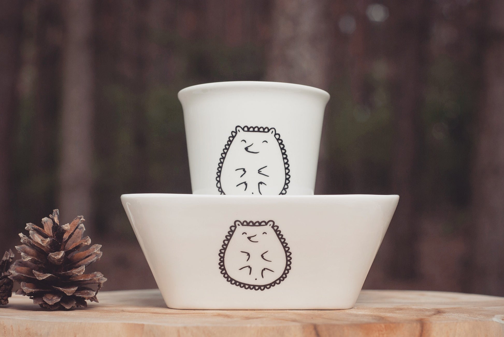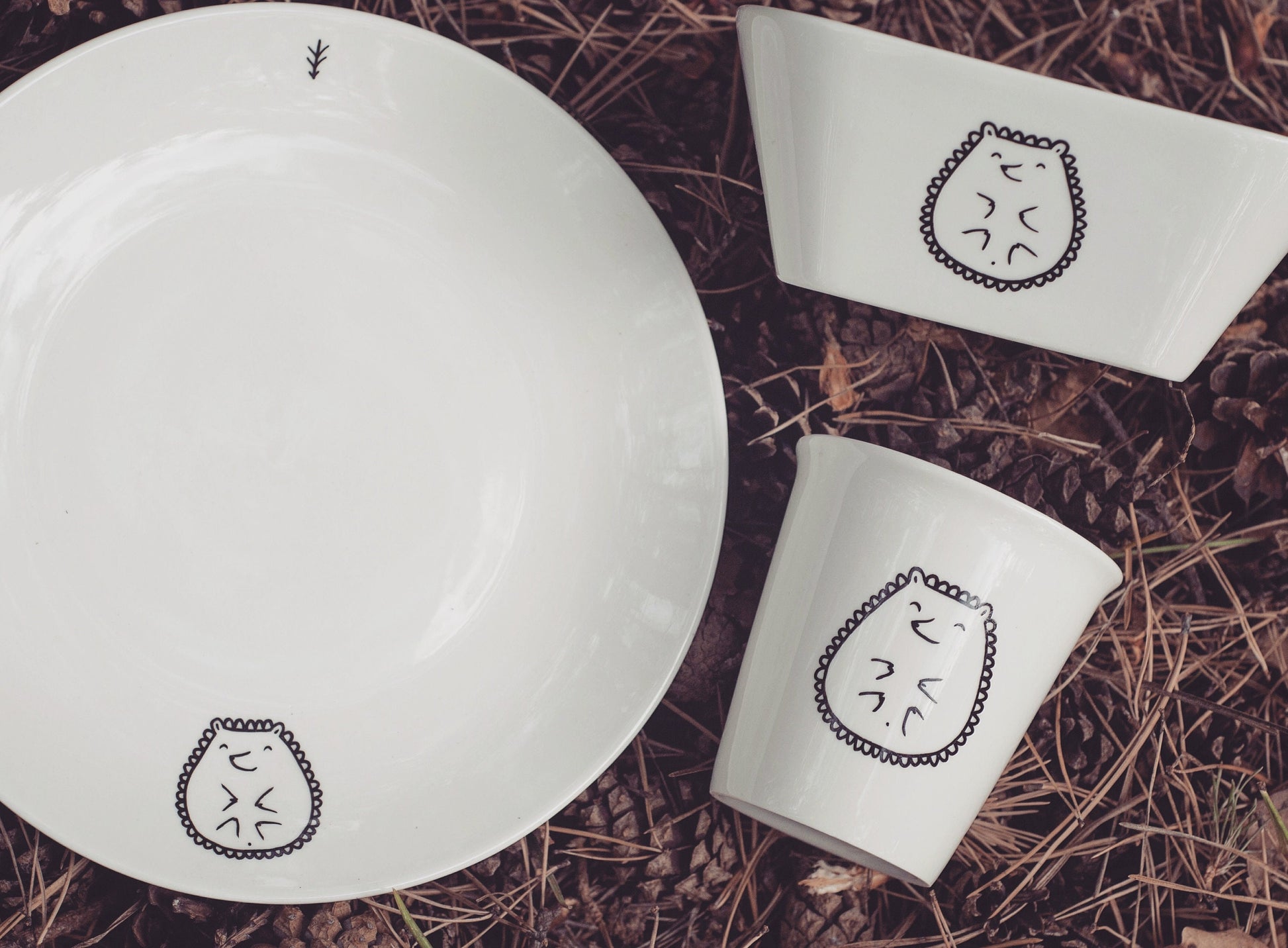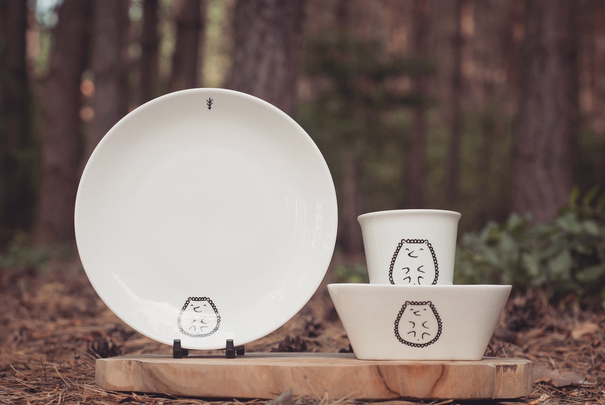 A hand painted set of dishes : CUP / BOWL / PLATE with a cute and chubby Hedgehog illustration.