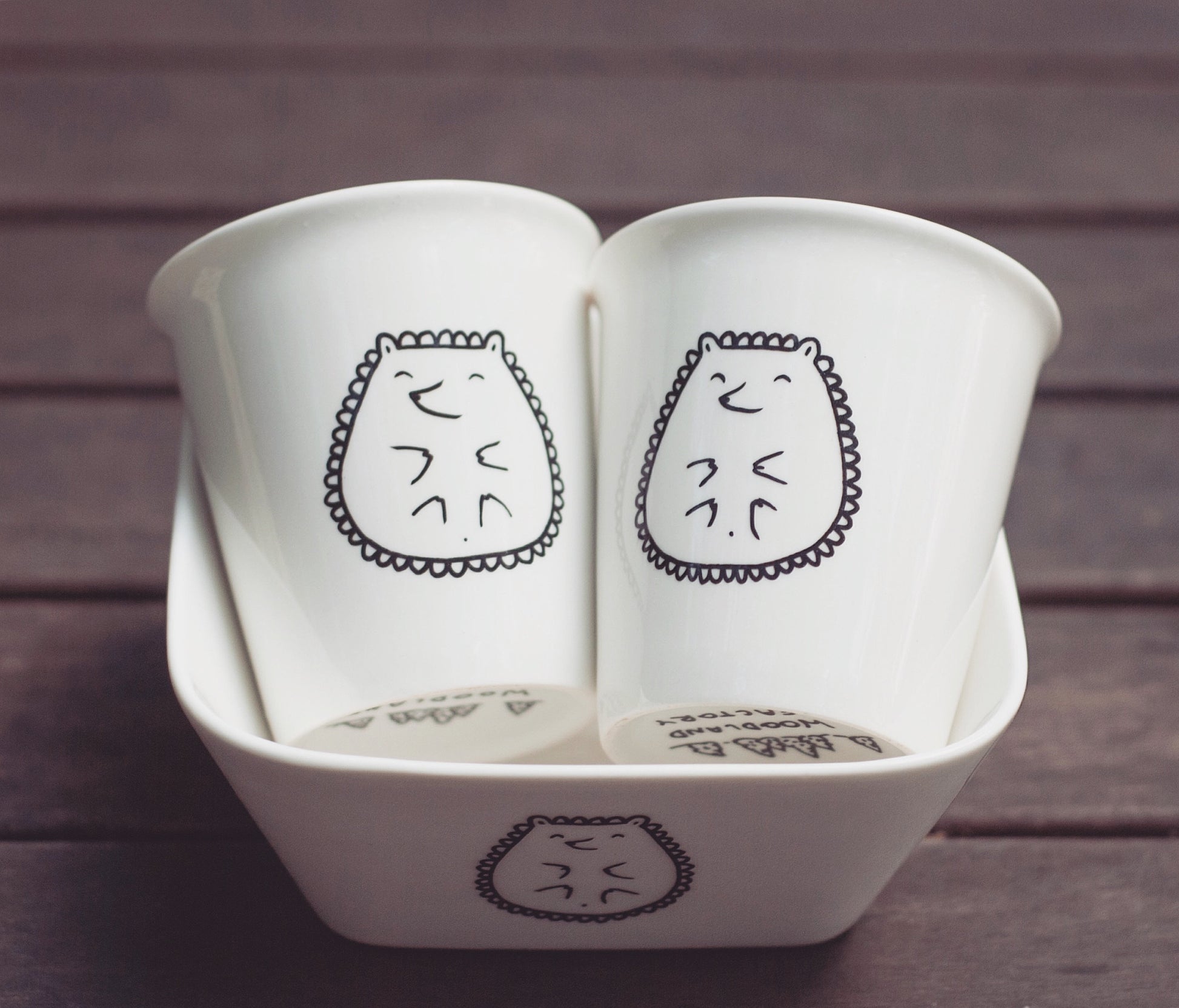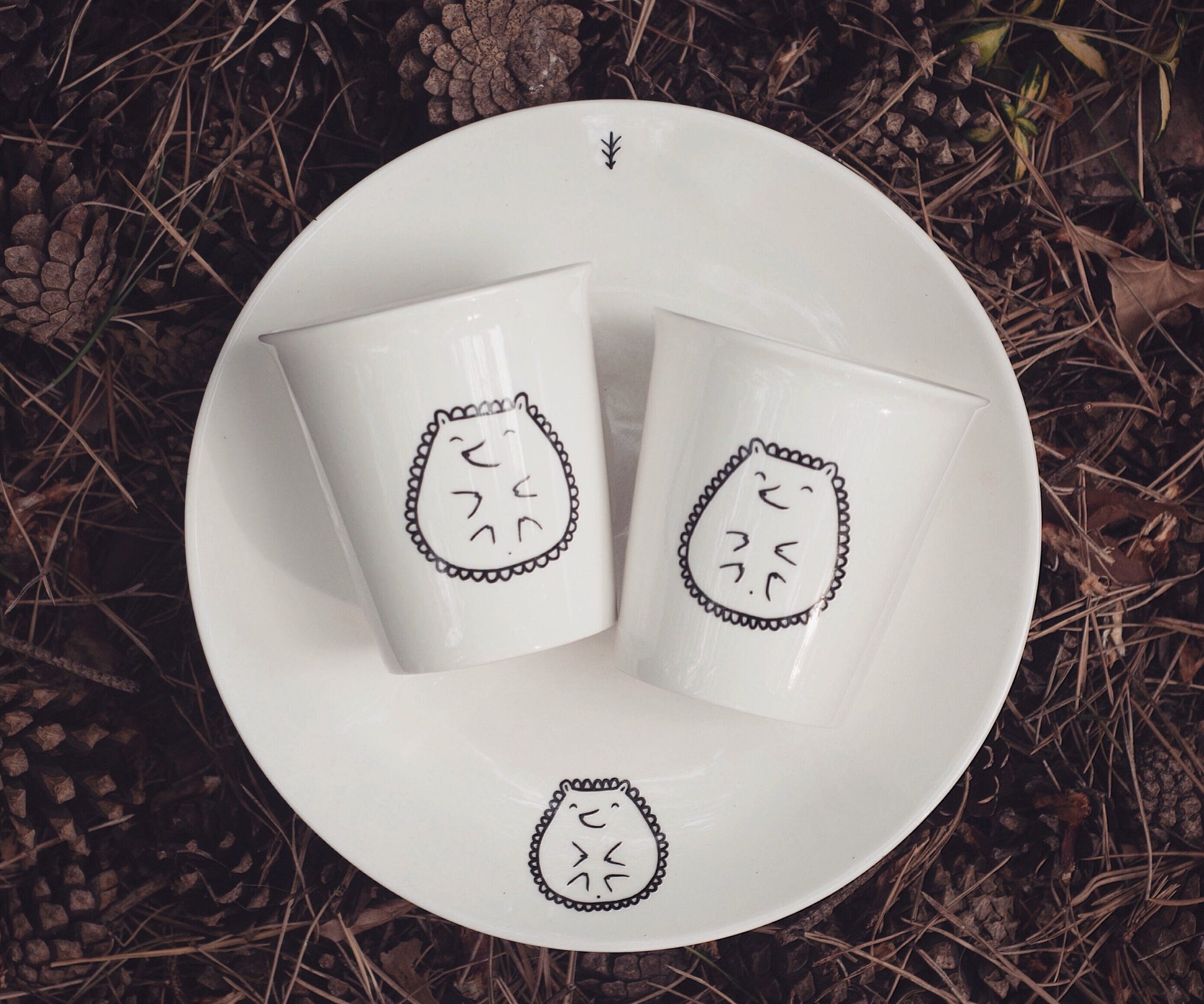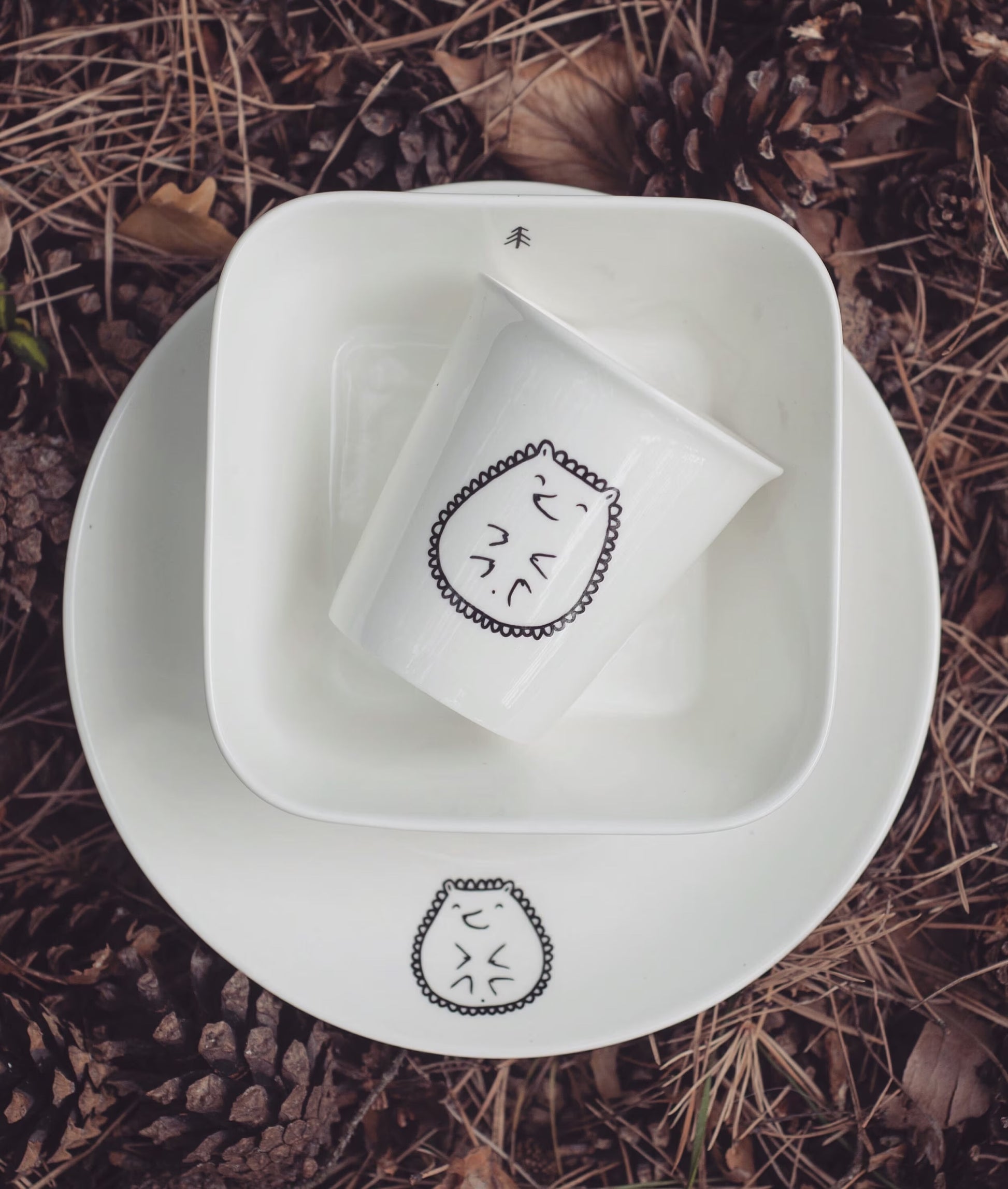 A hand painted set of dishes : CUP / BOWL / PLATE with a cute and chubby Hedgehog illustration.