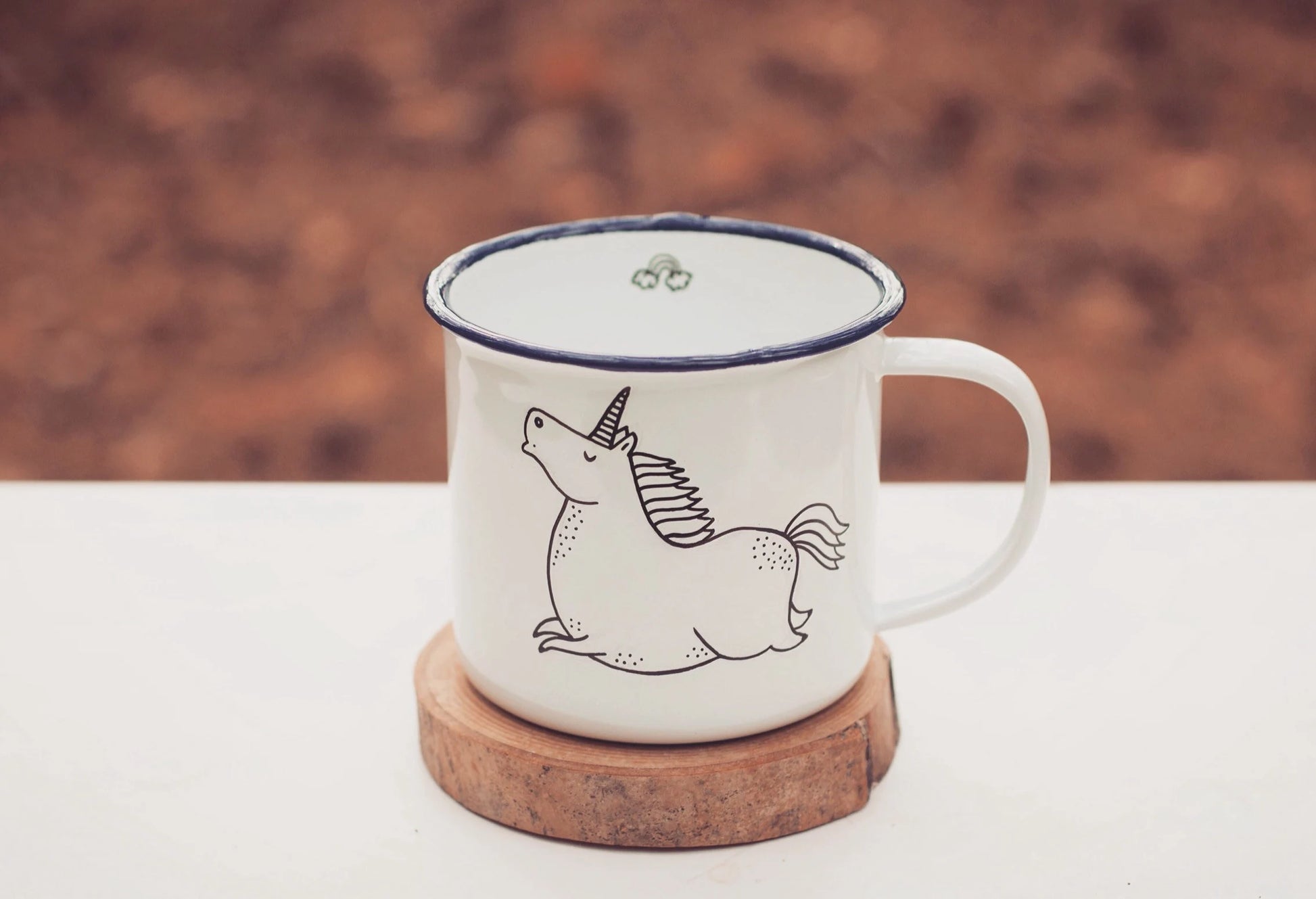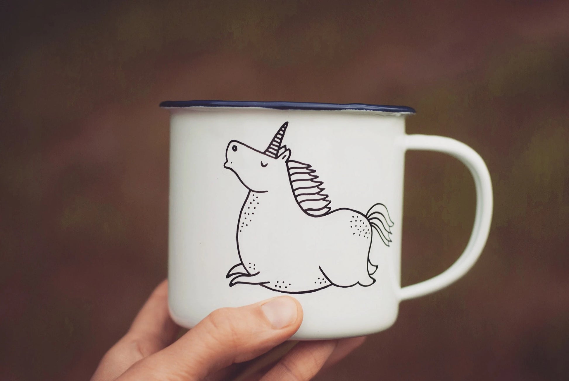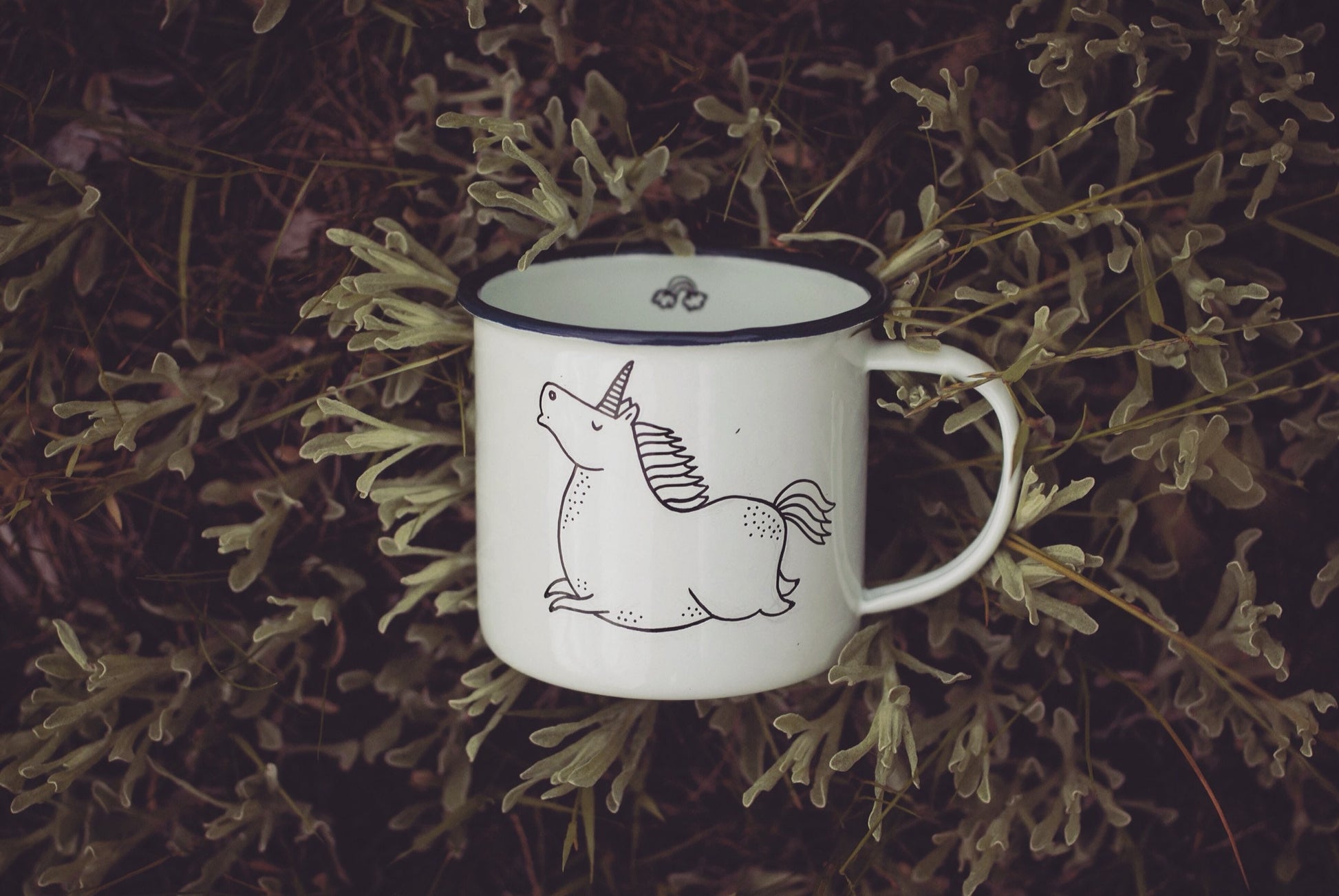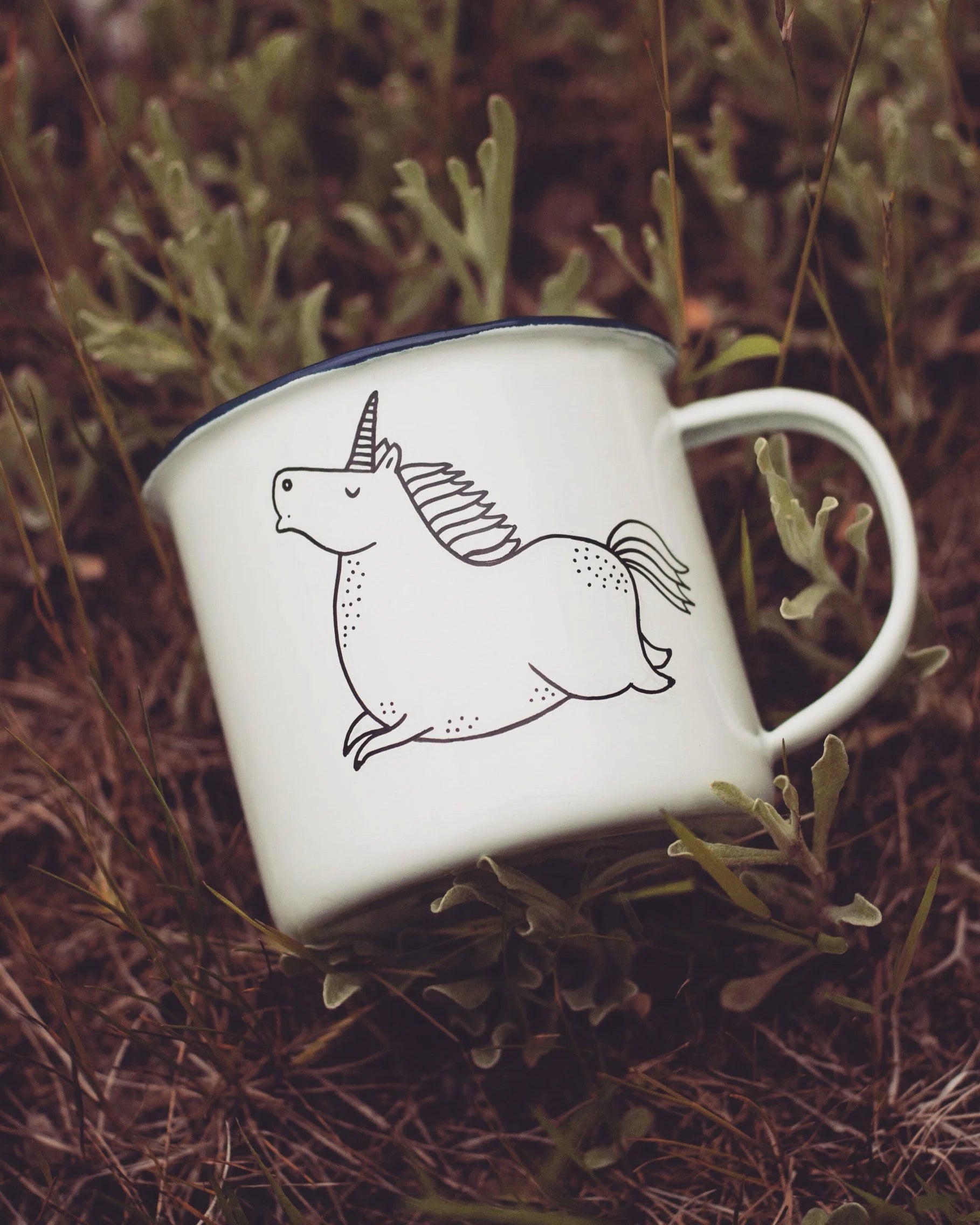 A hand painted enamel coated mug with a rather chubby UNICORN :)