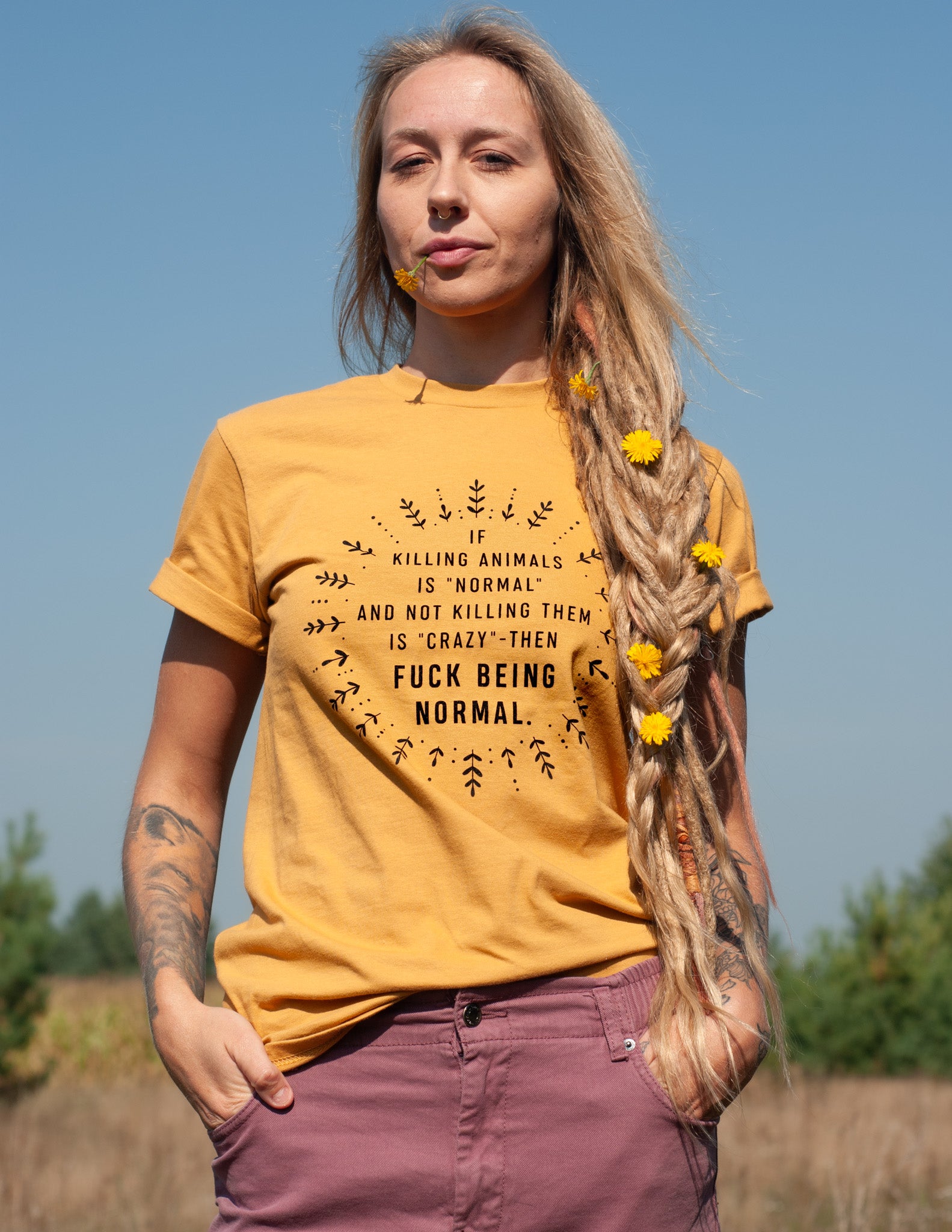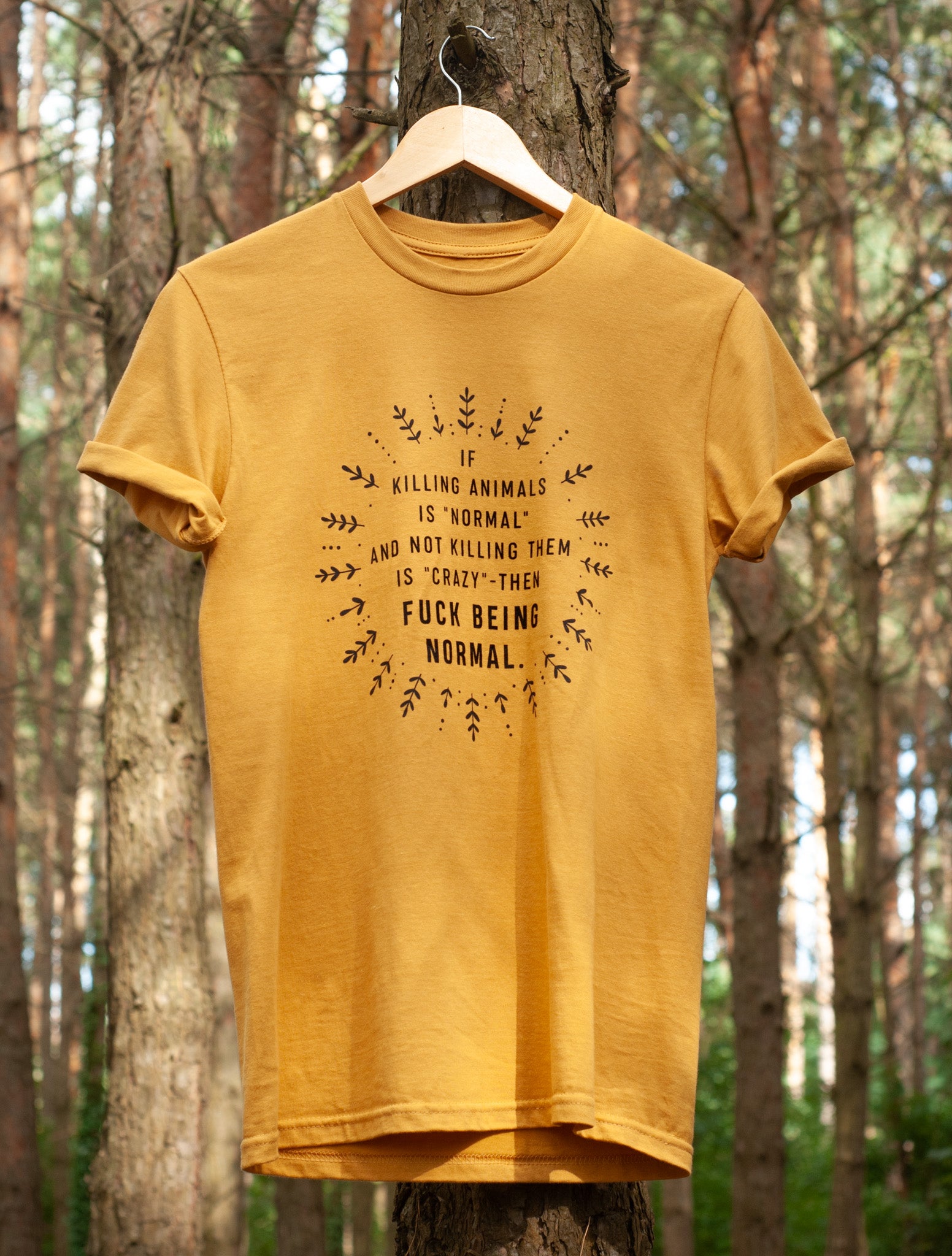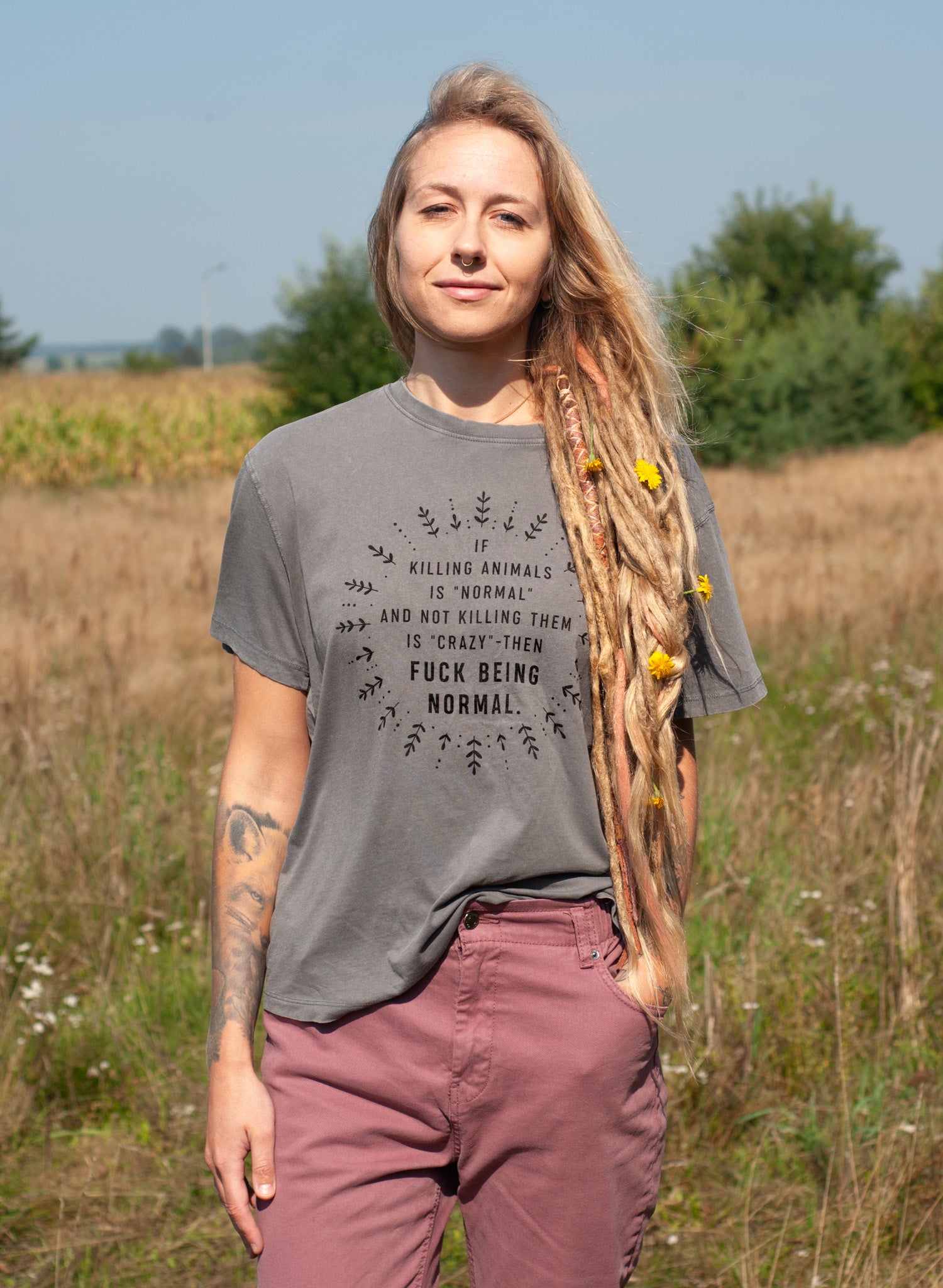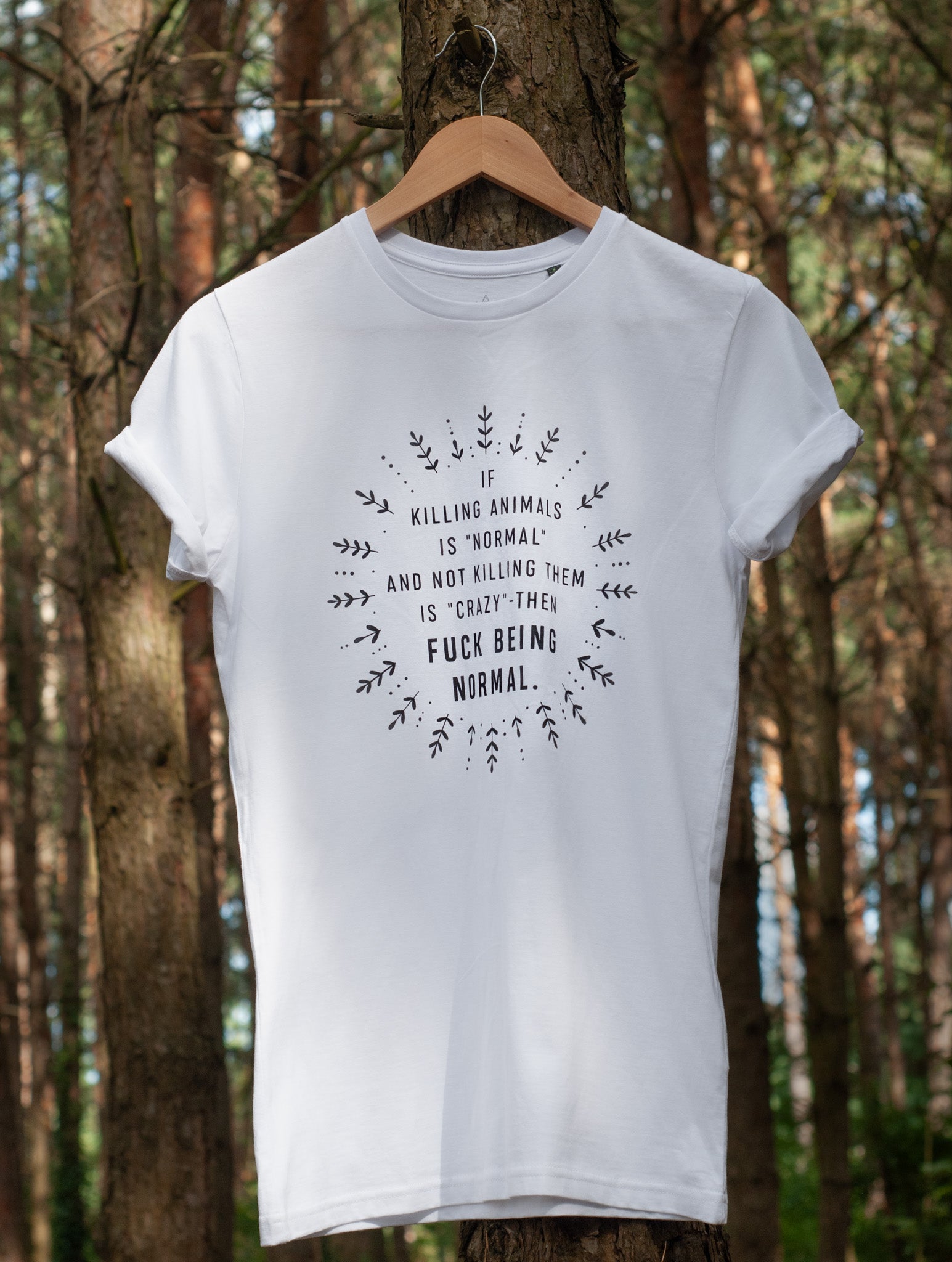 Z przodu koszulki widnieje nadruk w języku angielskim mówiący: „Jeśli zabijanie zwierząt to 'normalność', a nie zabijanie to 'szaleństwo' – to pieprzyć bycie normalnym.”