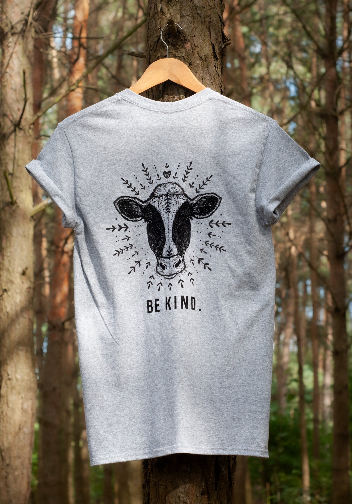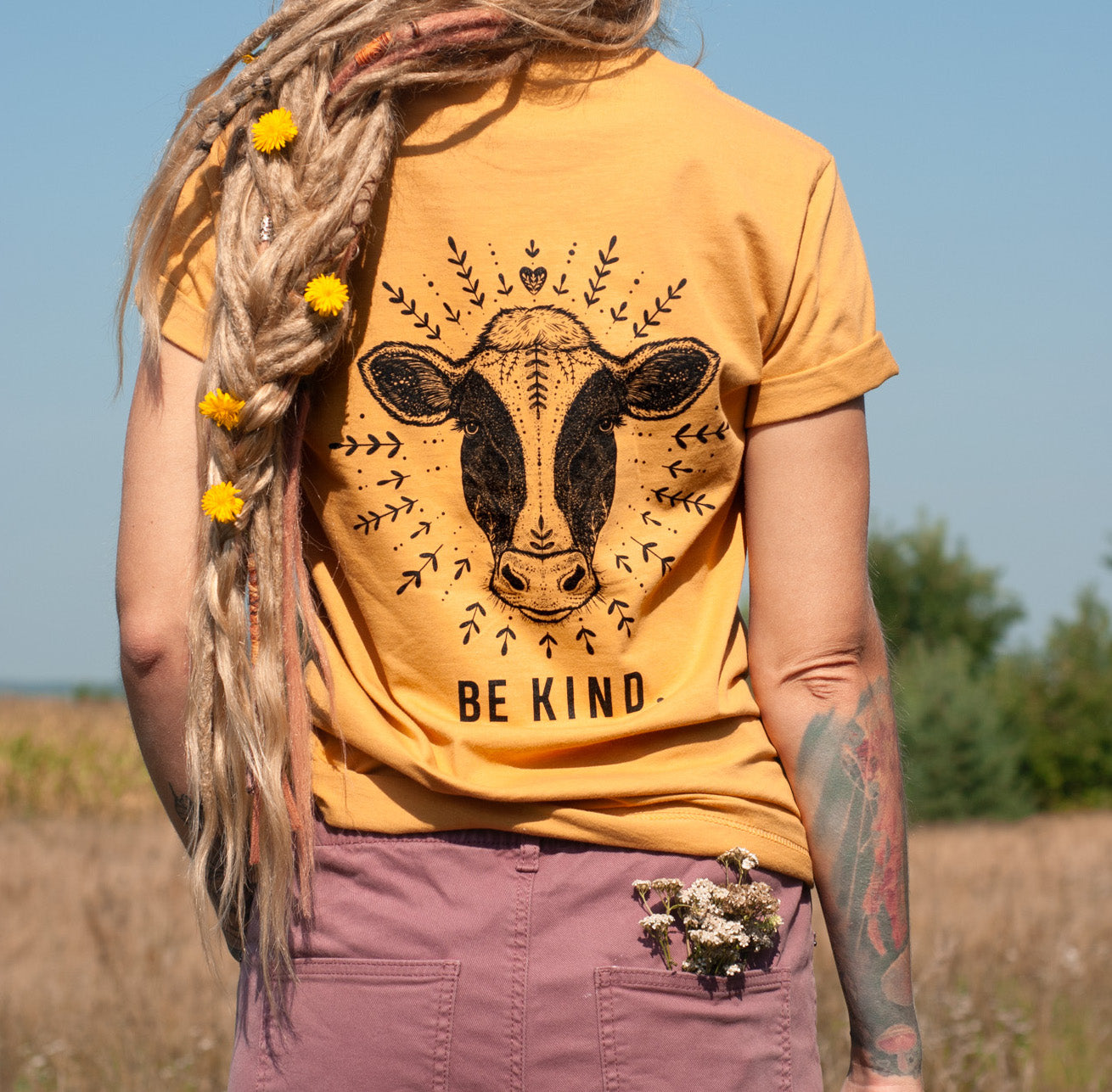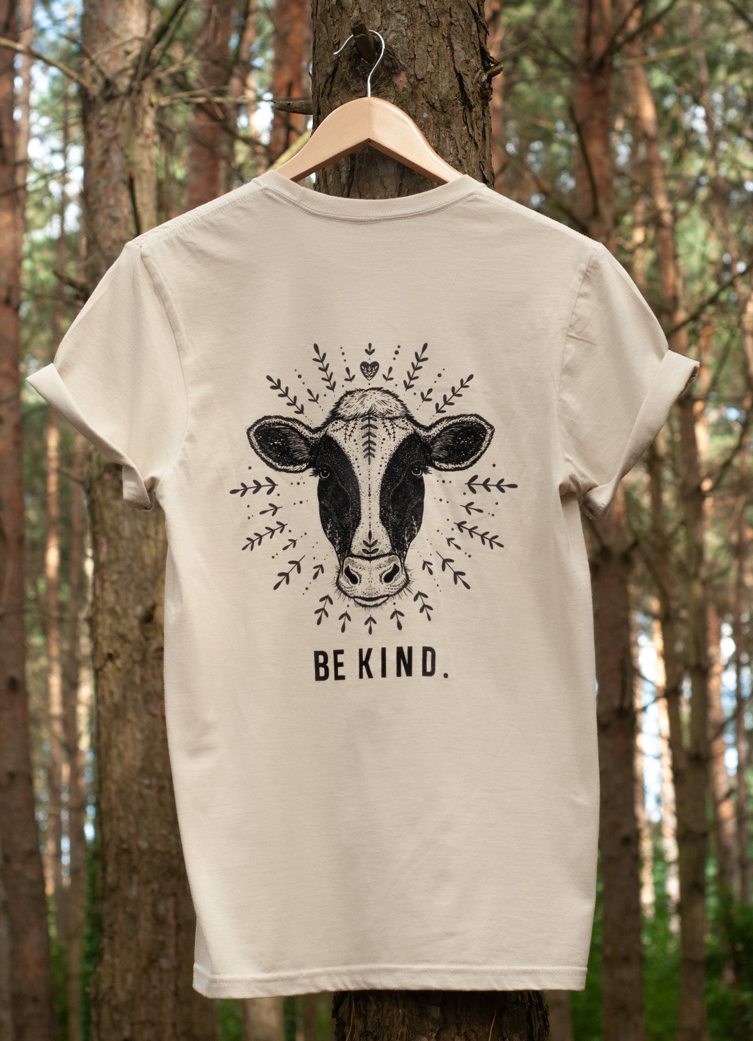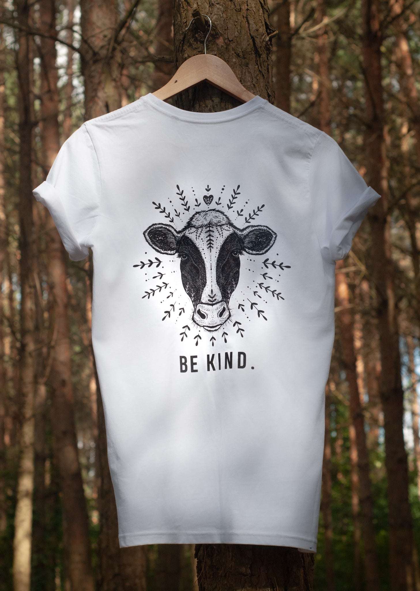Tył koszulki ozdabia urocza krowia ilustracja oraz napis „Be Kind” - czyli wezwanie do czynienia dobra :)