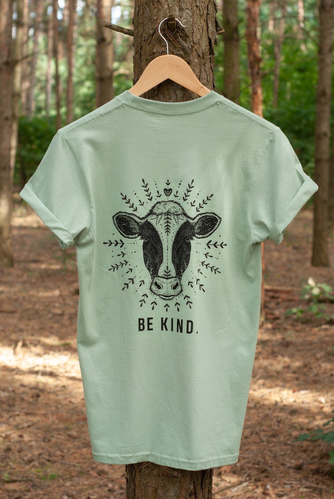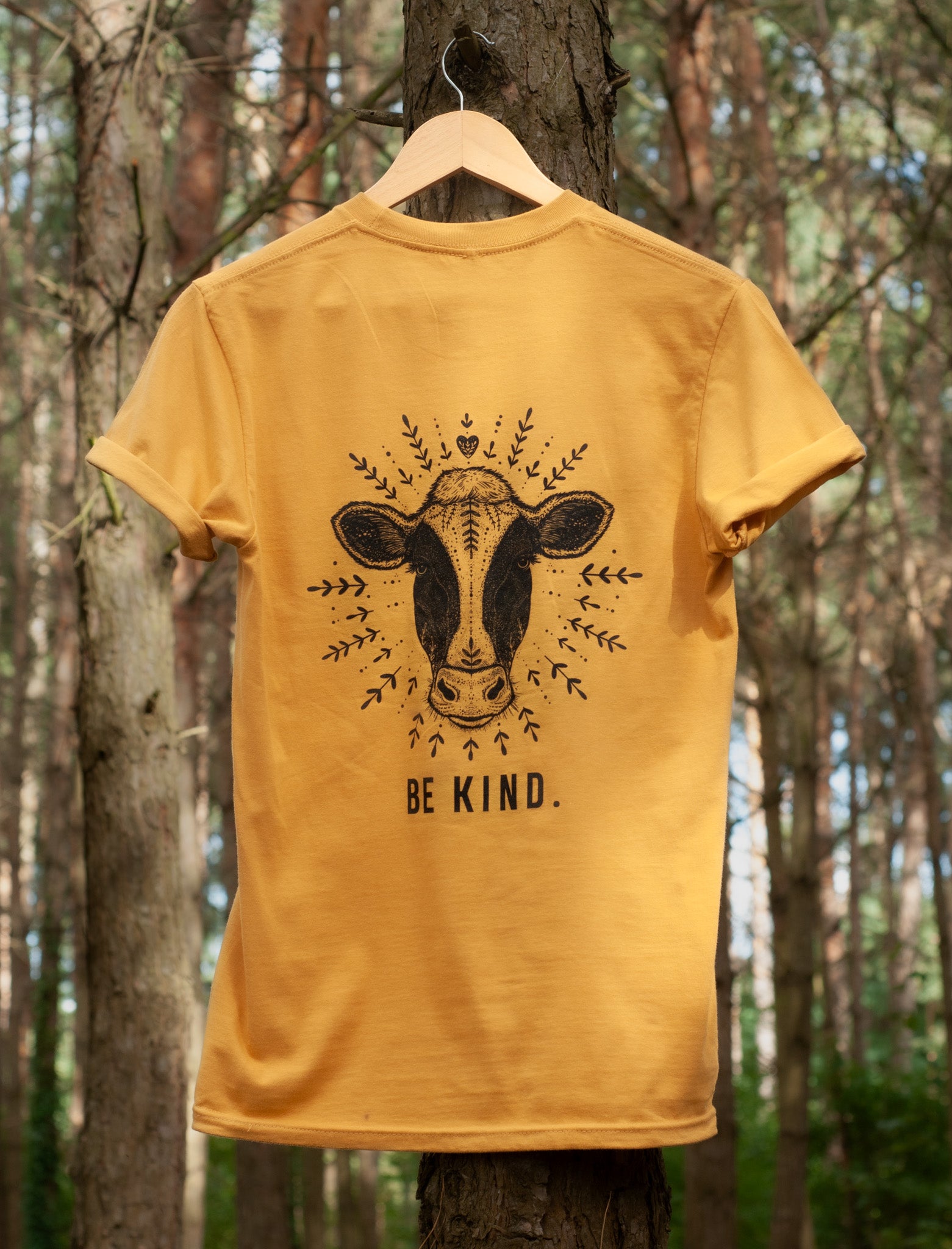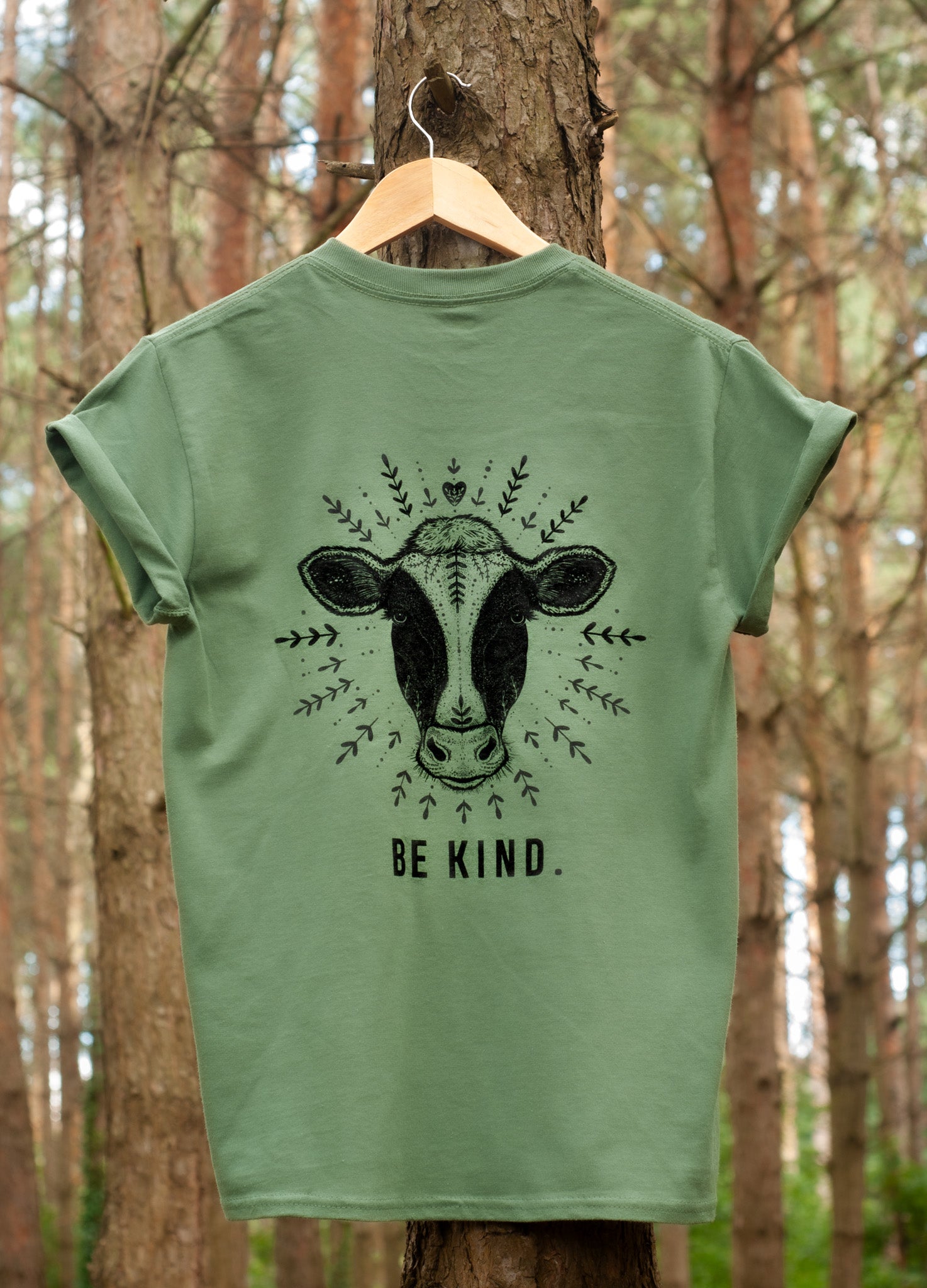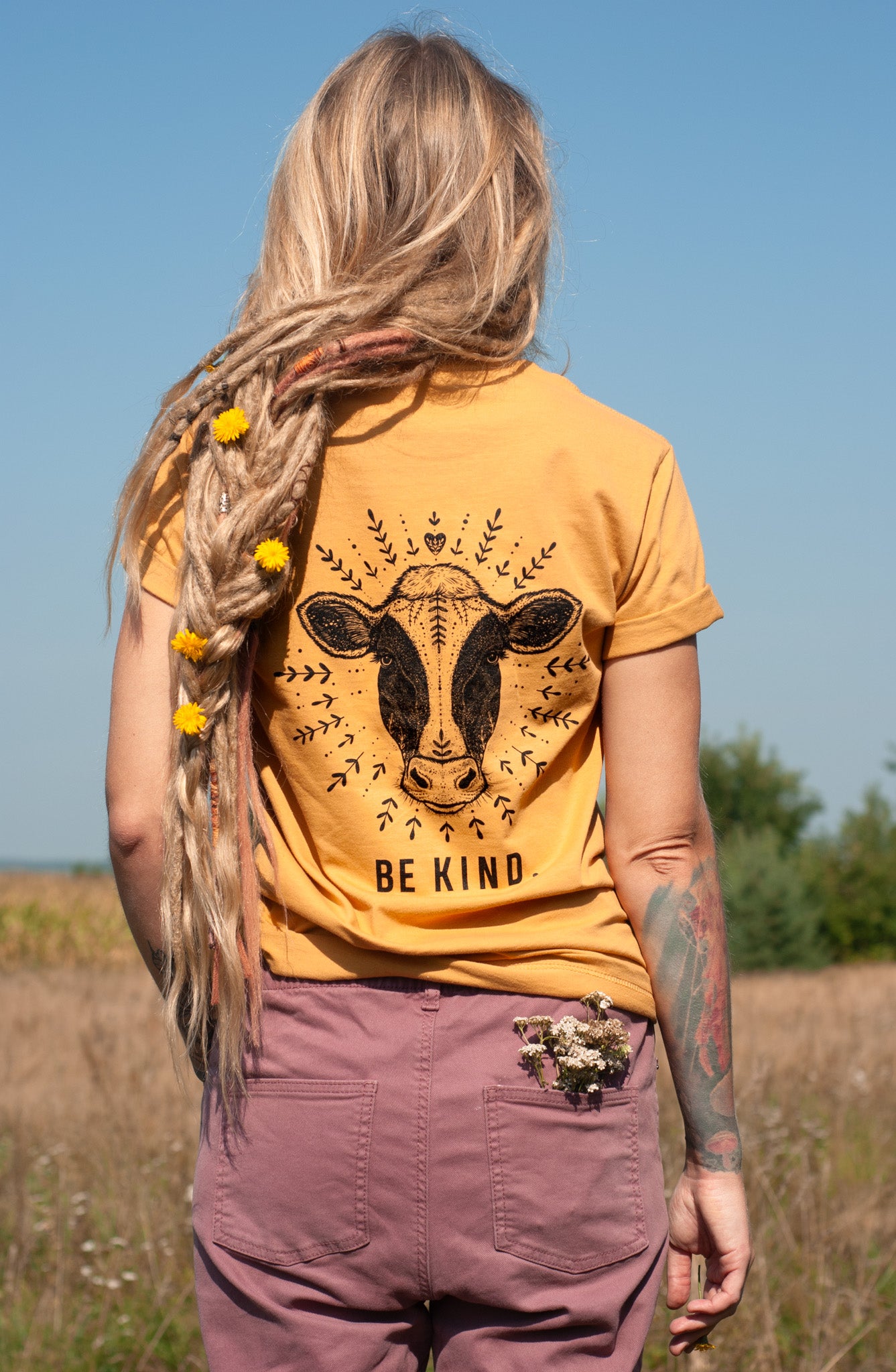 Tył koszulki ozdabia urocza krowia ilustracja oraz napis „Be Kind” - czyli wezwanie do czynienia dobra :)